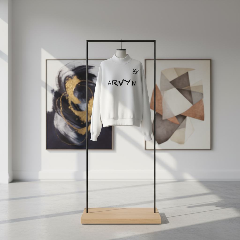 DETAILS: MOCK-NECK COLLAR, DROPPED SHOULDERS, RIB HEM AND CUFFS